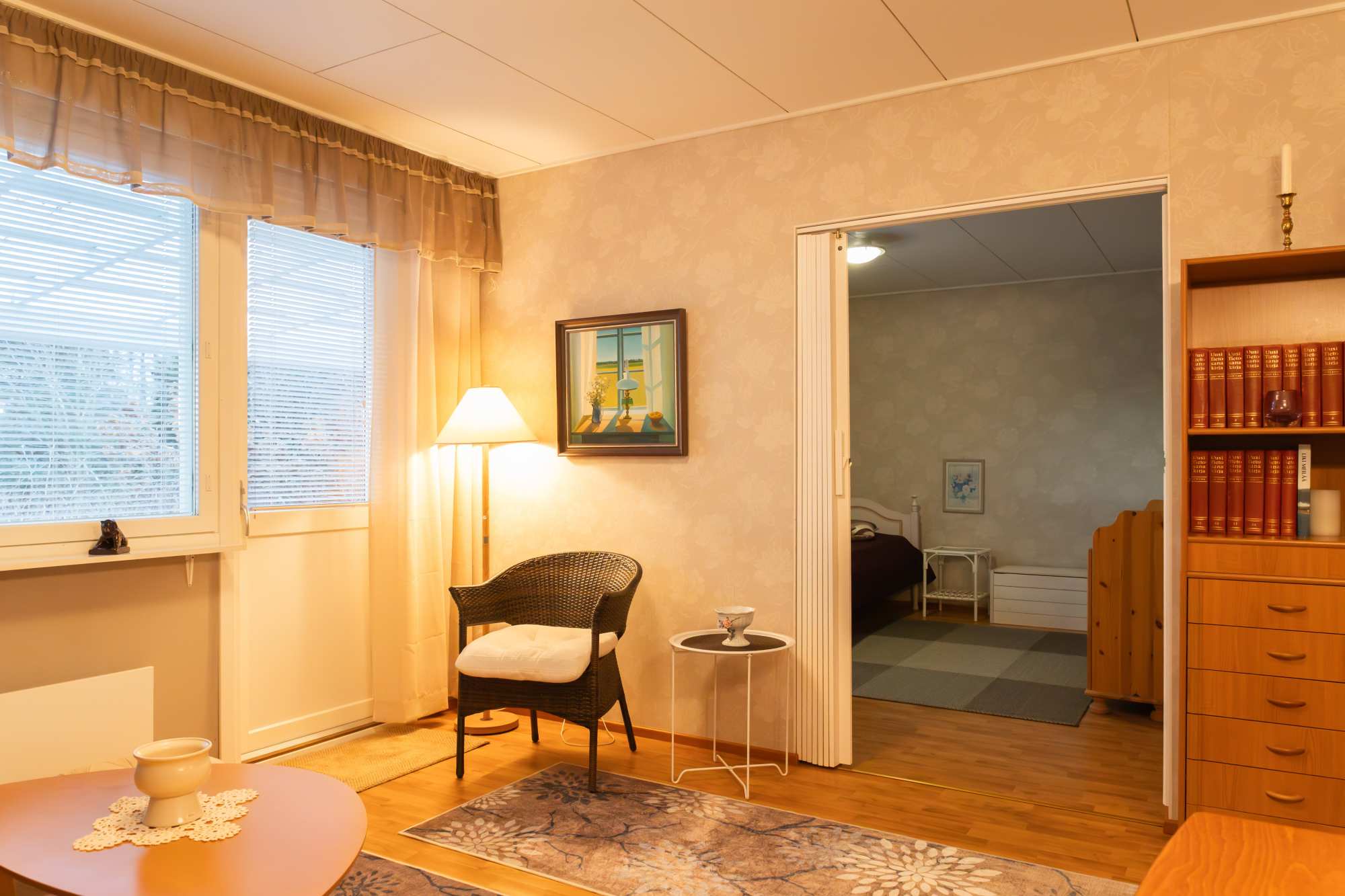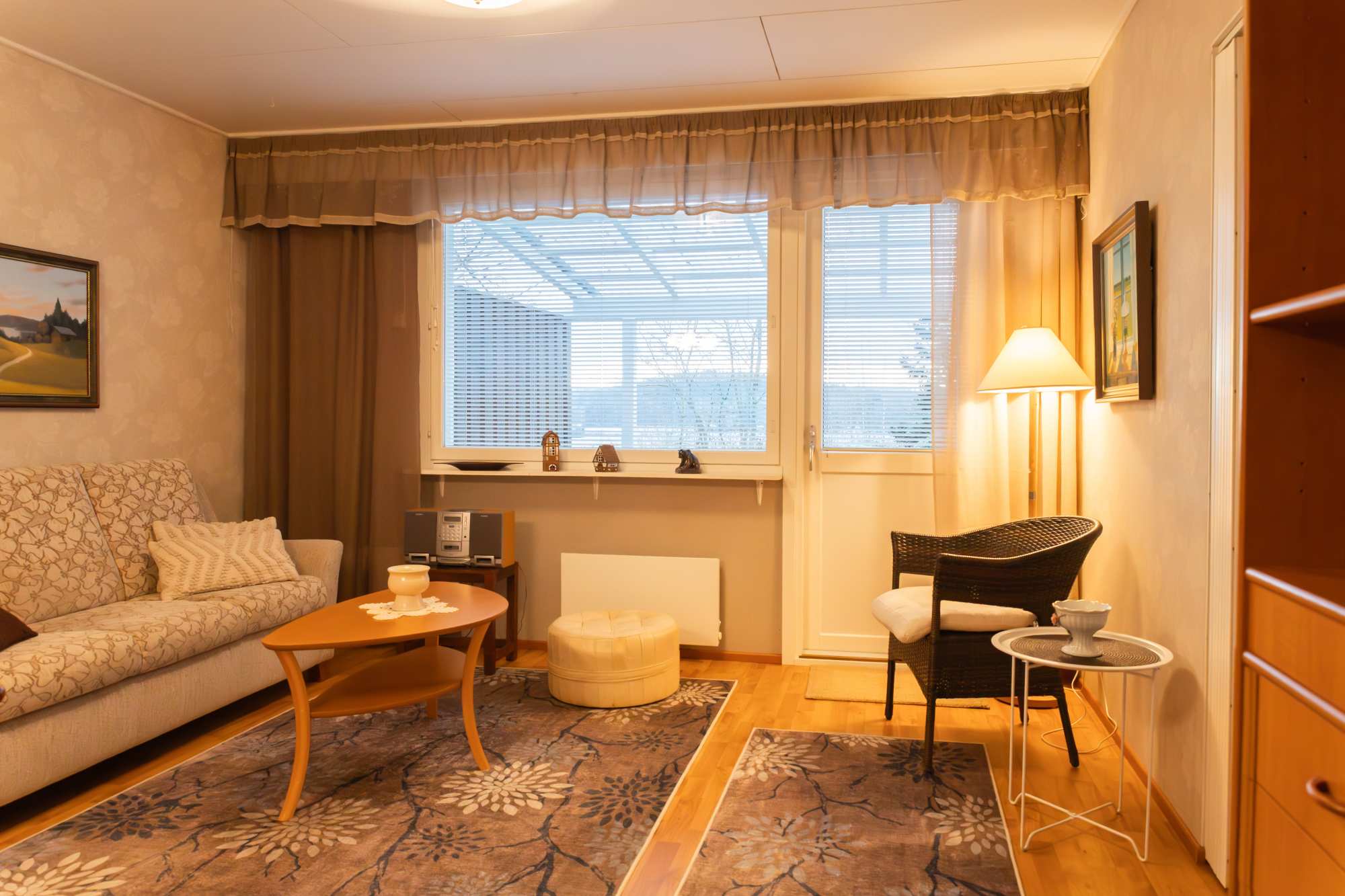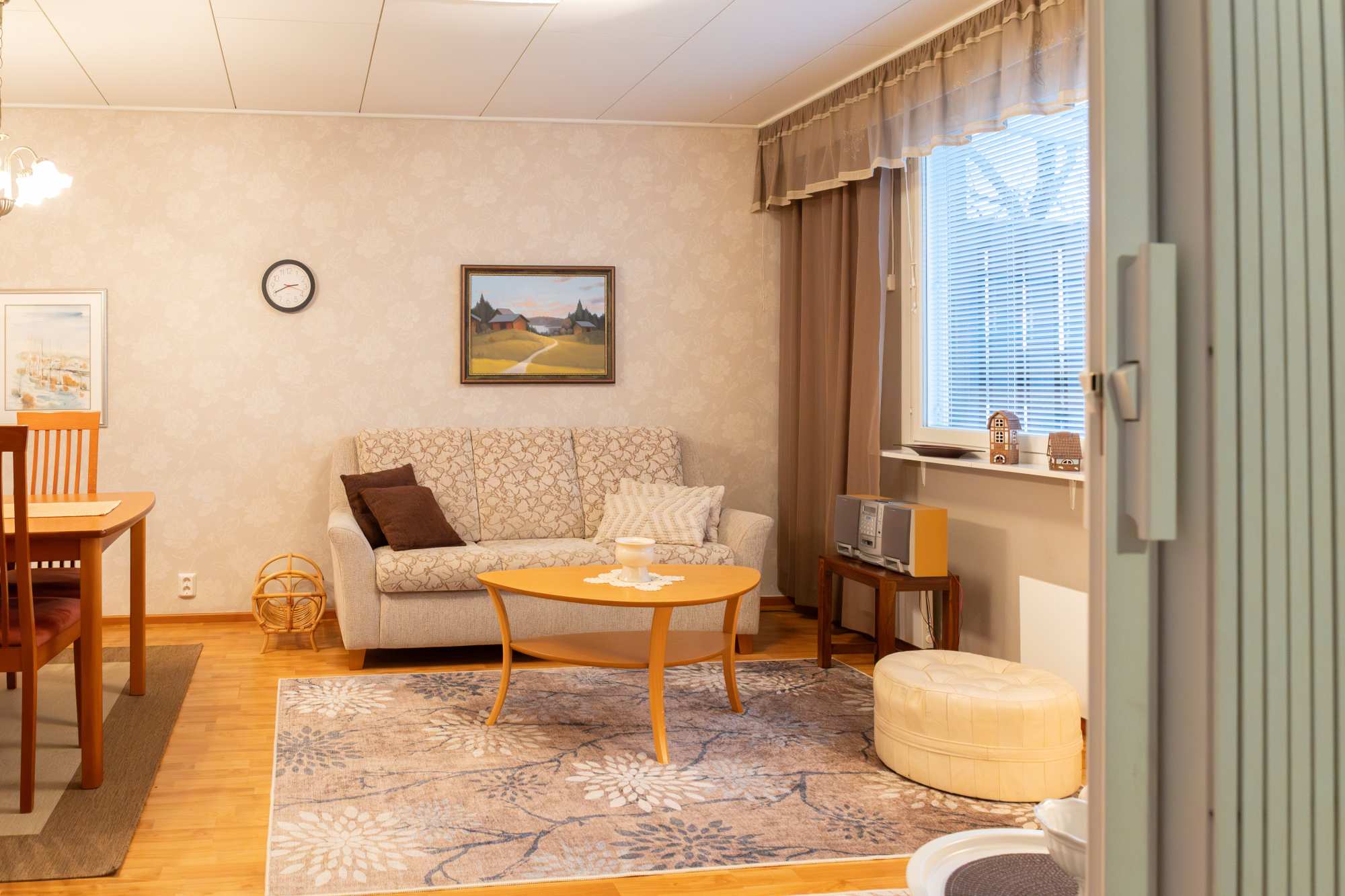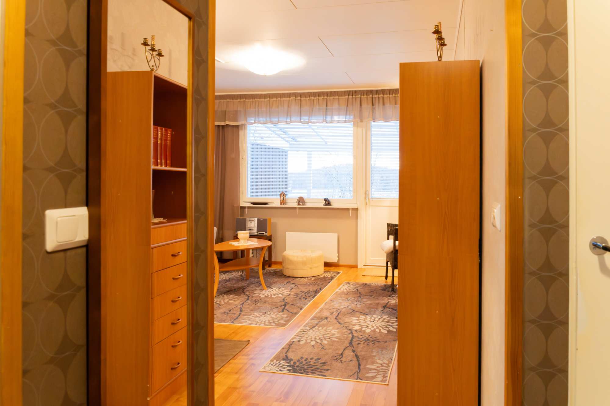 | Olohuoneen materiaalit | Lattia: Laminaatti Seinät: Tapetti |