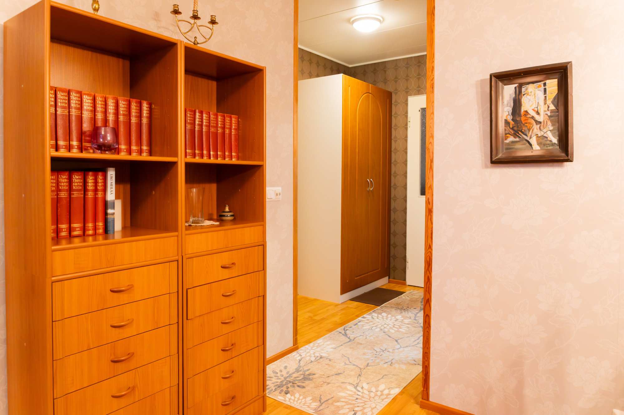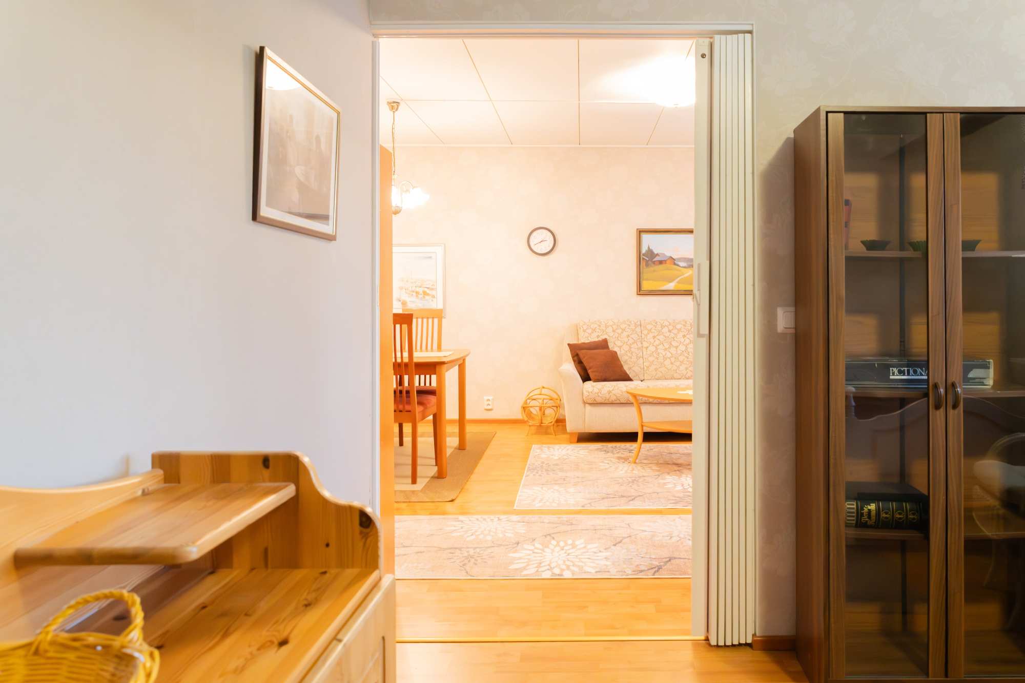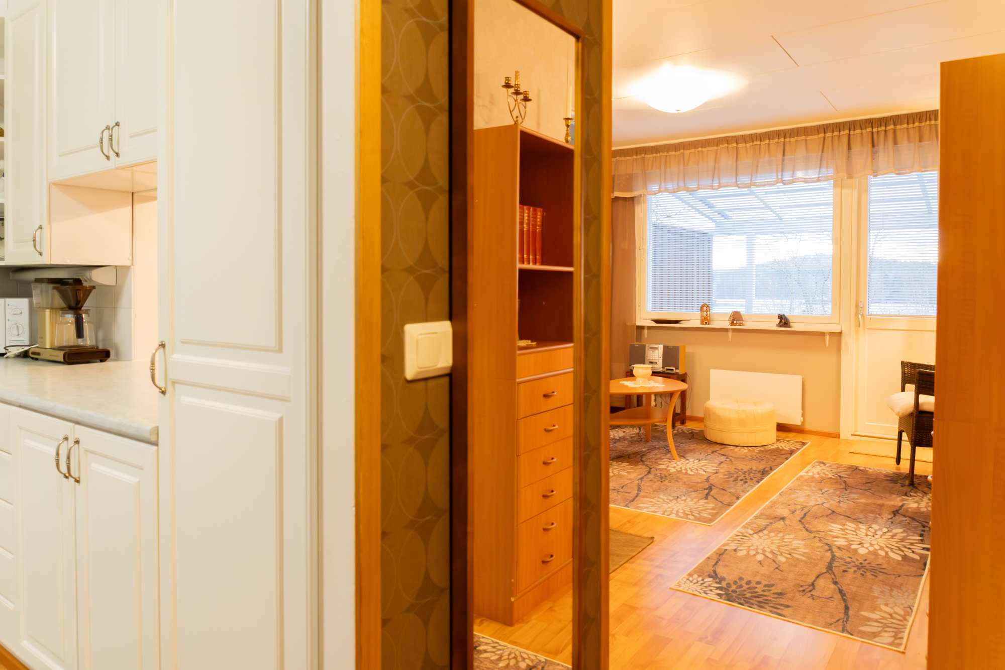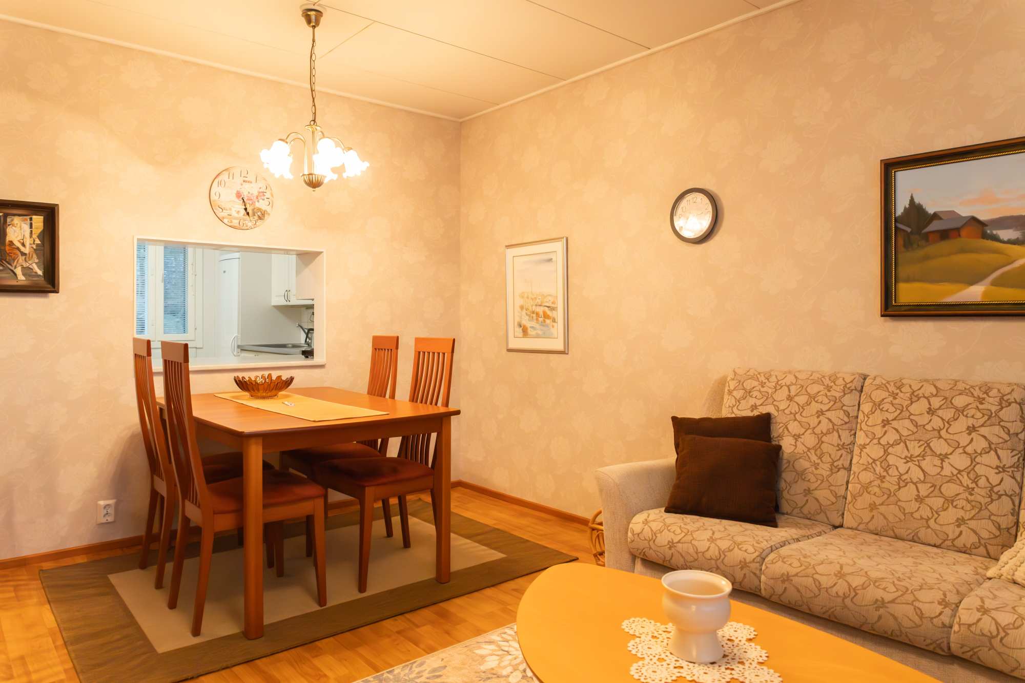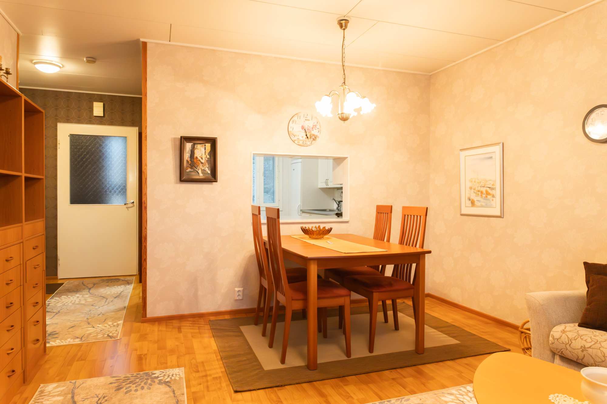 | Olohuoneen materiaalit | Lattia: Laminaatti Seinät: Tapetti |