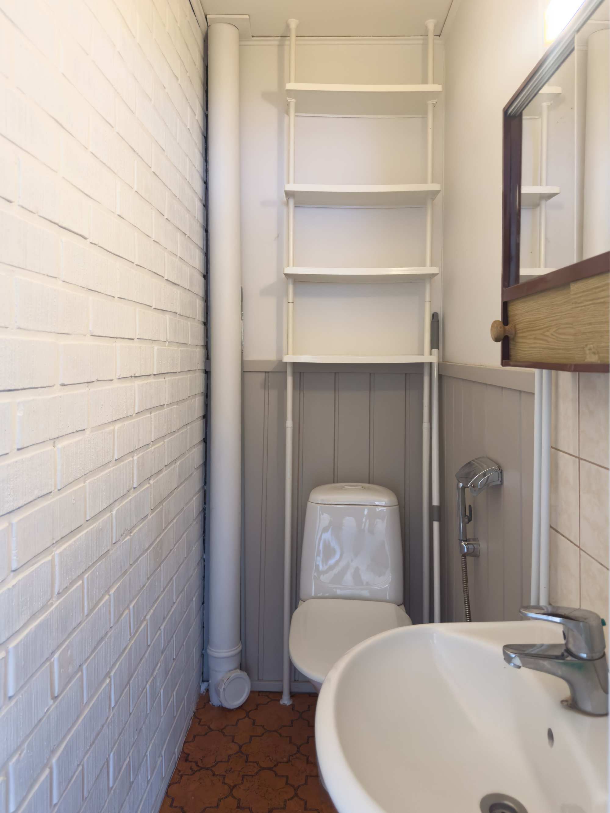 | Erillinen WC | Vessan seinän ja katon rajassa näkyvissä vanha kosteusvaurio hormin juuressa. |