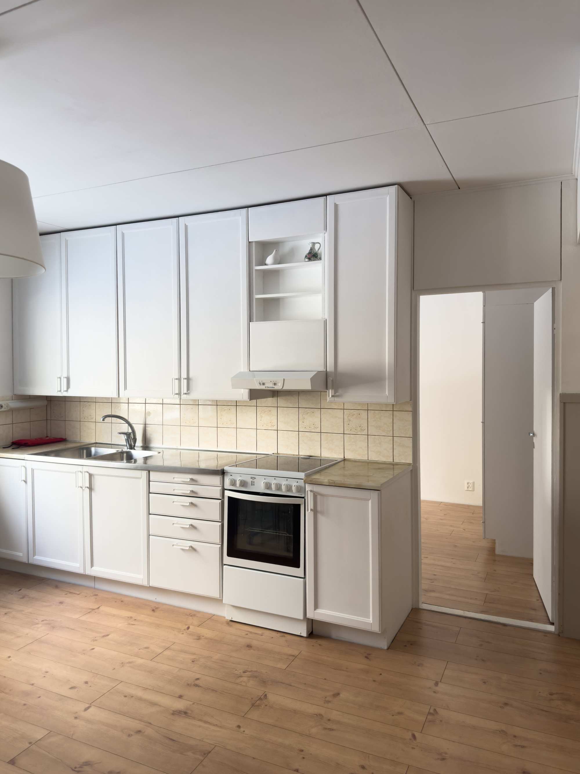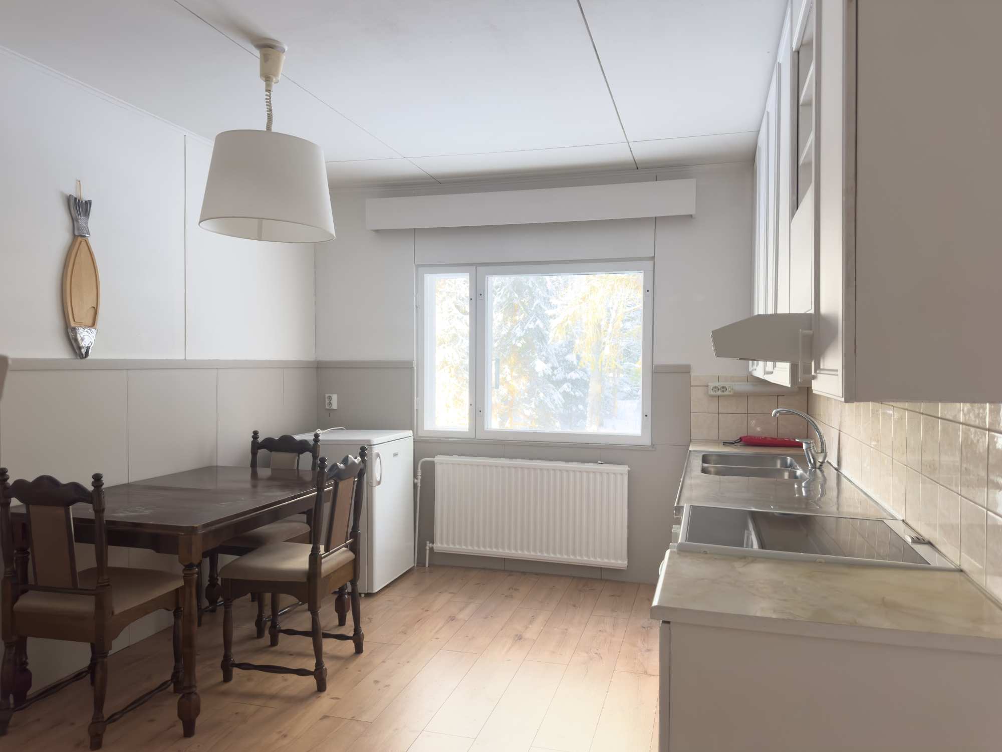 | Keittiön materiaalit | Lattia: Muovimatto Seinät: Välitilassa laatta ja maali |