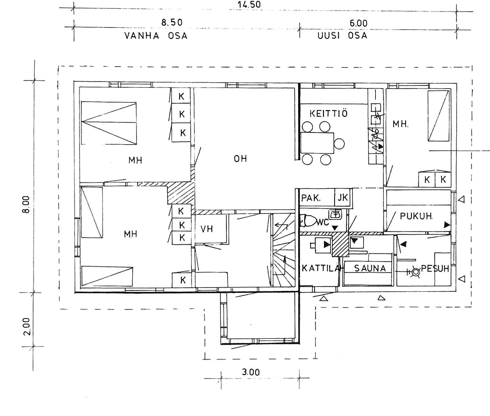 | Rakennusvuosi, lisätietoja | Talo rakennettu vuonna 1962 ja laajennettu vuonna 1976. Laajennusosassa keittiö+mh+sc+pukuh.+psh+s. Laajennusosa perustettu betonilaatalle |