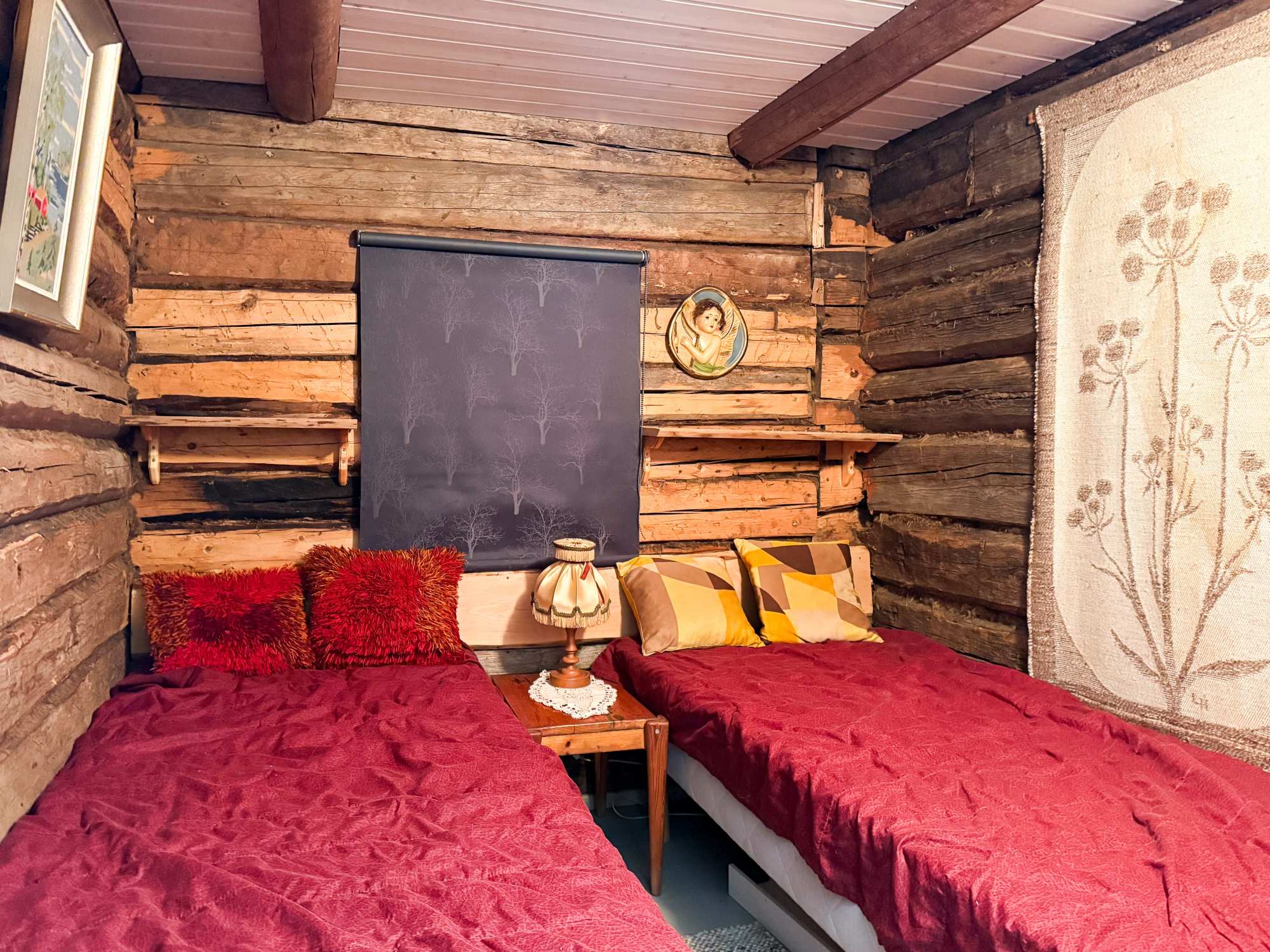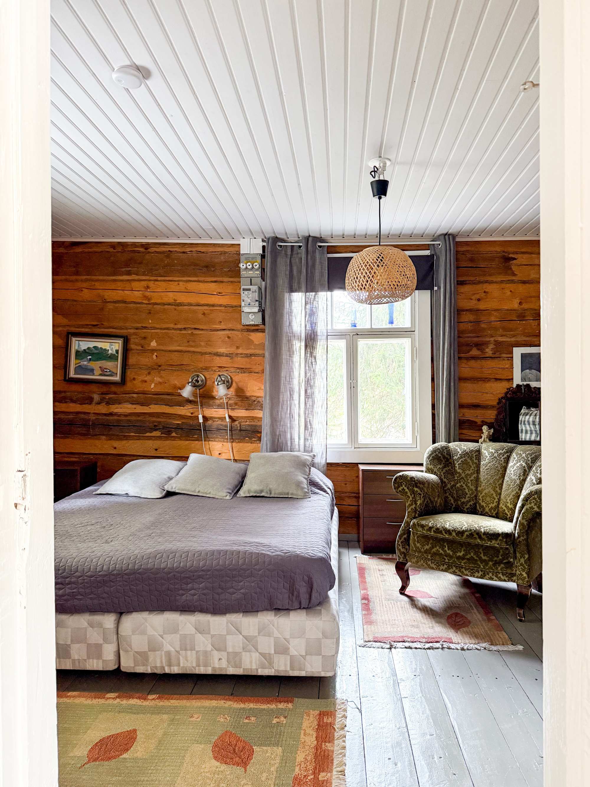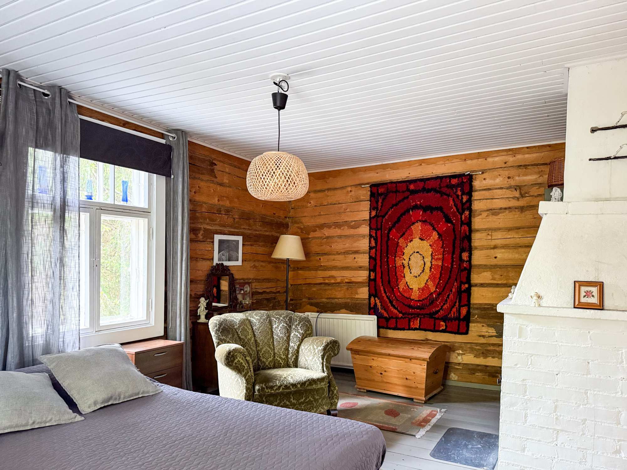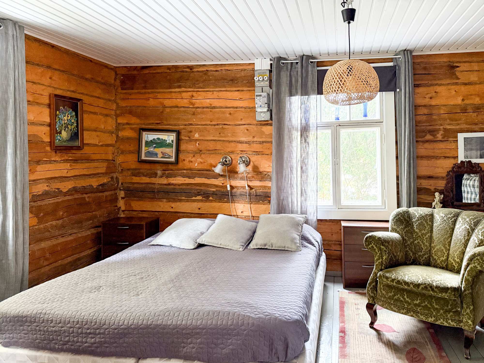 | Makuuhuoneen materiaalit | Lattia: Lauta Seinät: Hirsi |