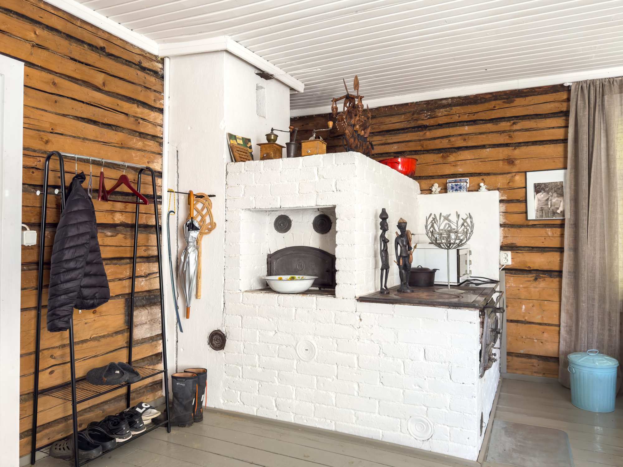 | Keittiön materiaalit | Lattia: Lauta Seinät: Hirsi |